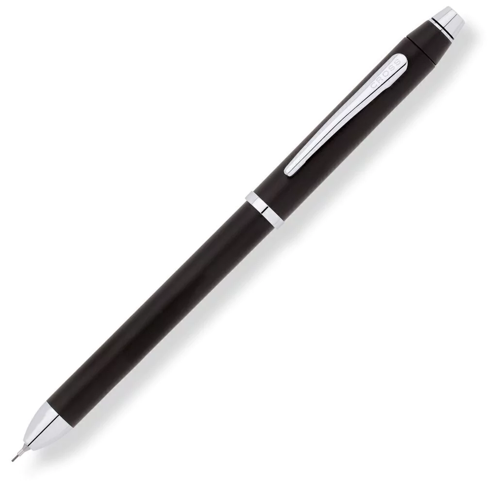 Un ingenioso bolígrafo multiuso. Cambie de un bolígrafo negro a uno rojo o a un portaminas con un suave giro. Acabado disponible en negro o azul satinado con detalles en cromo pulido. En estuche de regalo. Garantía mecánica de por vida.
